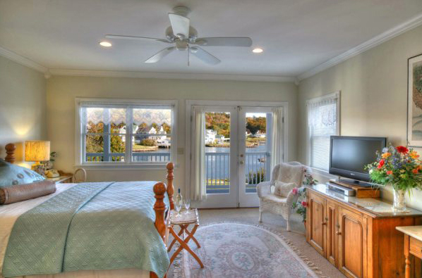 This convenient First Floor room on a private corner, catches the cool breezes of the bay. It is clad in sand colored walls, and decorated in cool shades of teal and cream, and adorned with nautical and Asian prints. The pine cannonball QUEEN poster bed is accompanied by two antique end tables, and hand cast pottery lamps from Devon England. Included is an art nouveau desk, an overstuffed reading chair plus an additional upholstered chair, and a 37" flat TV. Quiet mini/split air conditioning and ceiling fan will keep the temperature just the way you like it.
