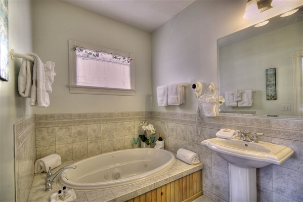 The modern bath has a pedistal sink, a small stand alone shower, and a soothing tiled one person jacuzzi bath. Frig w/ice, microwave and Keuric coffee maker is in-room.